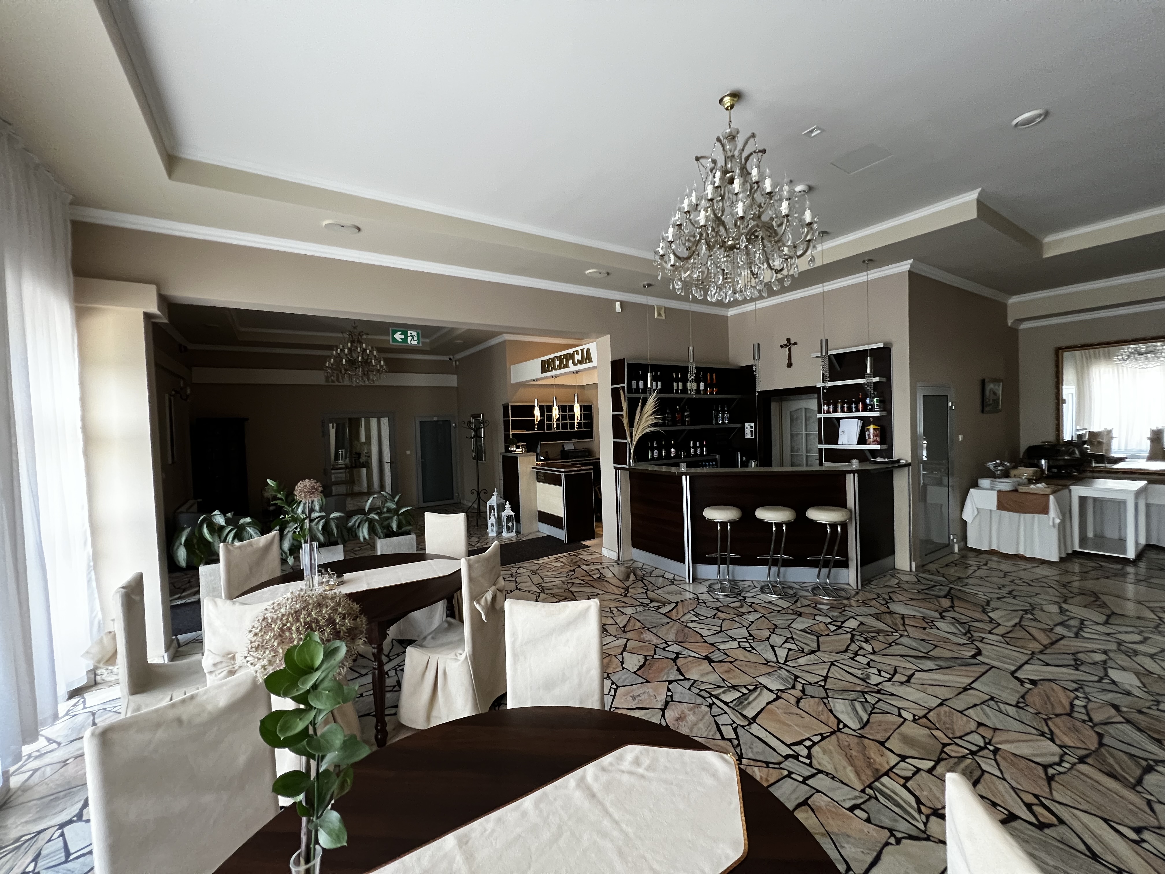 Forma szwedzkiego stołu, duży wybór potraw zarówno na ciepło i zimno. Kawa z ekspresu i na oczekiwanie gościa parzona przez obsługę. Super kameralnie, spokojnie blisko do Bydgoszczy. Komunikacja podmiejska i miejska tania i szybka. Przystanek autobusowy, tuż przy hotelu więc nie trzeba jechać do centrum Bydgoszczy swoim Samochodem. Polecam!!!